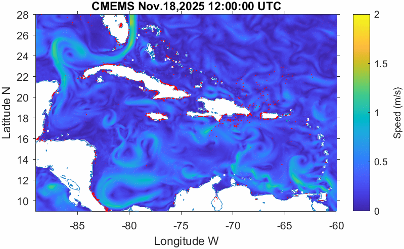 Each red dot corresponds to a sargassum patch identified by the “AFAI” thanks to satellites. The sargassum layer is influenced by environmental conditions in the area, such as currents and winds. Based on current forecasts from “HYCOM” and wind forecasts from “NCEP”, it is possible to estimate the trajectory of the sargassum and its possible arrival along Caribbean beaches.