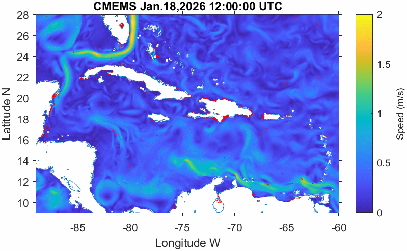 Cada punto rojo corresponde a una mancha de sargazo identificada por la "AFAI" gracias a los satélites. La capa de sargazo está influenciada por las condiciones ambientales de la zona, como las corrientes y los vientos. A partir de las previsiones de corrientes de HYCOM y de las previsiones de vientos del NCEP, es posible estimar la trayectoria del sargazo y su posible llegada a las playas del Caribe.
