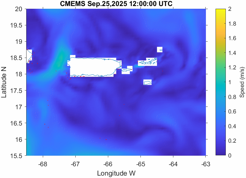 Cada punto rojo corresponde a una mancha de sargazo identificada por la "AFAI" gracias a los satélites. La capa de sargazo está influenciada por las condiciones ambientales de la zona, como las corrientes y los vientos. A partir de las previsiones de corrientes de HYCOM y de las previsiones de vientos del NCEP, es posible estimar la trayectoria del sargazo y su posible llegada a las playas del Caribe.