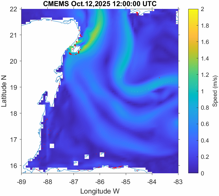 Chaque point rouge correspond à une nappe de sargasses repérée par la « AFAI » grâce aux satellites. La nappe de sargasses est influencée par les conditions environnementales de la zone comme les courants et les vents. Ainsi, sur la base des prévisions de courants de l’organisme « HYCOM » et des vents de l’organisme « NCEP », il est possible d'estimer la trajectoire que suivront les sargasses et leurs éventuelles arrivées le long des plages des Caraïbes.