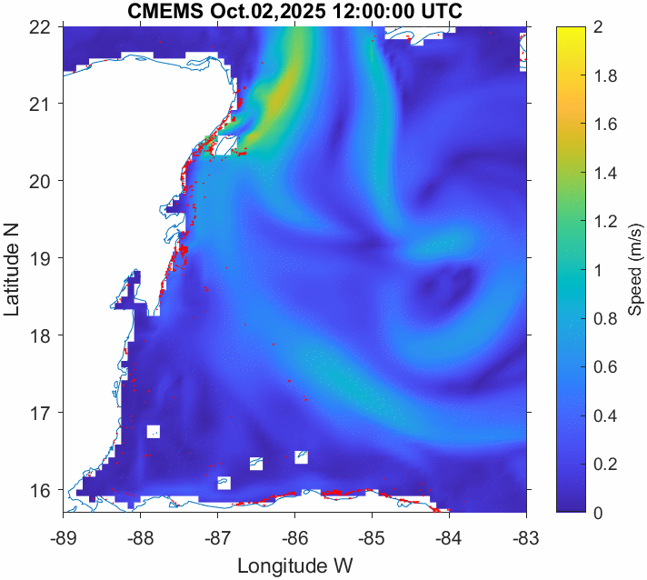 Chaque point rouge correspond à une nappe de sargasses repérée par la « AFAI » grâce aux satellites. La nappe de sargasses est influencée par les conditions environnementales de la zone comme les courants et les vents. Ainsi, sur la base des prévisions de courants de l’organisme « HYCOM » et des vents de l’organisme « NCEP », il est possible d'estimer la trajectoire que suivront les sargasses et leurs éventuelles arrivées le long des plages des Caraïbes.