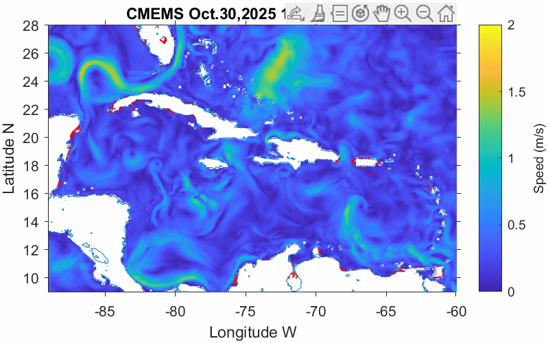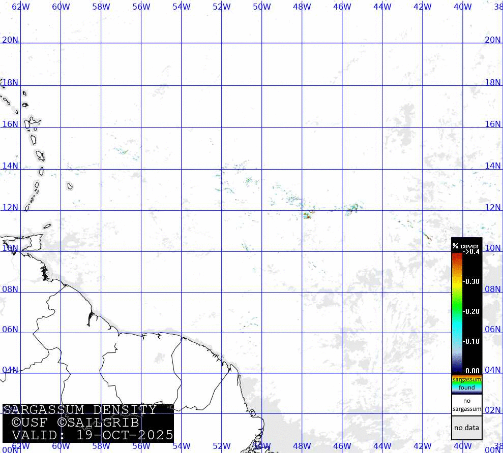 Chaque point rouge correspond à une nappe de sargasses repérée par la « AFAI » grâce aux satellites. La nappe de sargasses est influencée par les conditions environnementales de la zone comme les courants et les vents. Ainsi, sur la base des prévisions de courants de l’organisme « HYCOM » et des vents de l’organisme « NCEP », il est possible d'estimer la trajectoire que suivront les sargasses et leurs éventuelles arrivées le long des plages des Caraïbes.