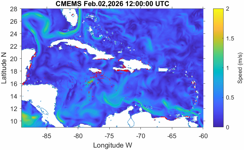 Chaque point rouge correspond à une nappe de sargasses repérée par la « AFAI » grâce aux satellites. La nappe de sargasses est influencée par les conditions environnementales de la zone comme les courants et les vents. Ainsi, sur la base des prévisions de courants de l’organisme « HYCOM » et des vents de l’organisme « NCEP », il est possible d'estimer la trajectoire que suivront les sargasses et leurs éventuelles arrivées le long des plages des Caraïbes.